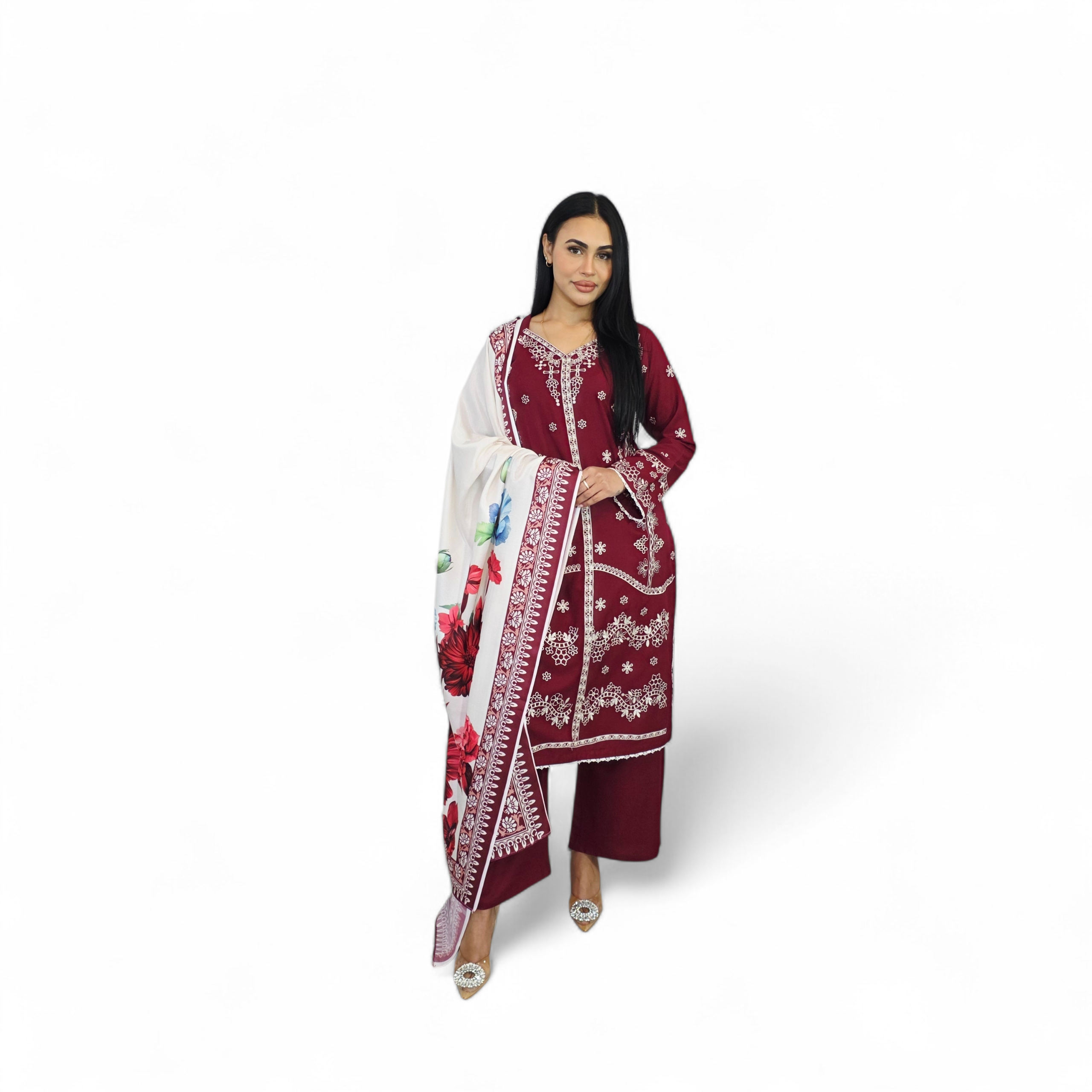 • Embroidered dhanak    kameez with  laces detailing