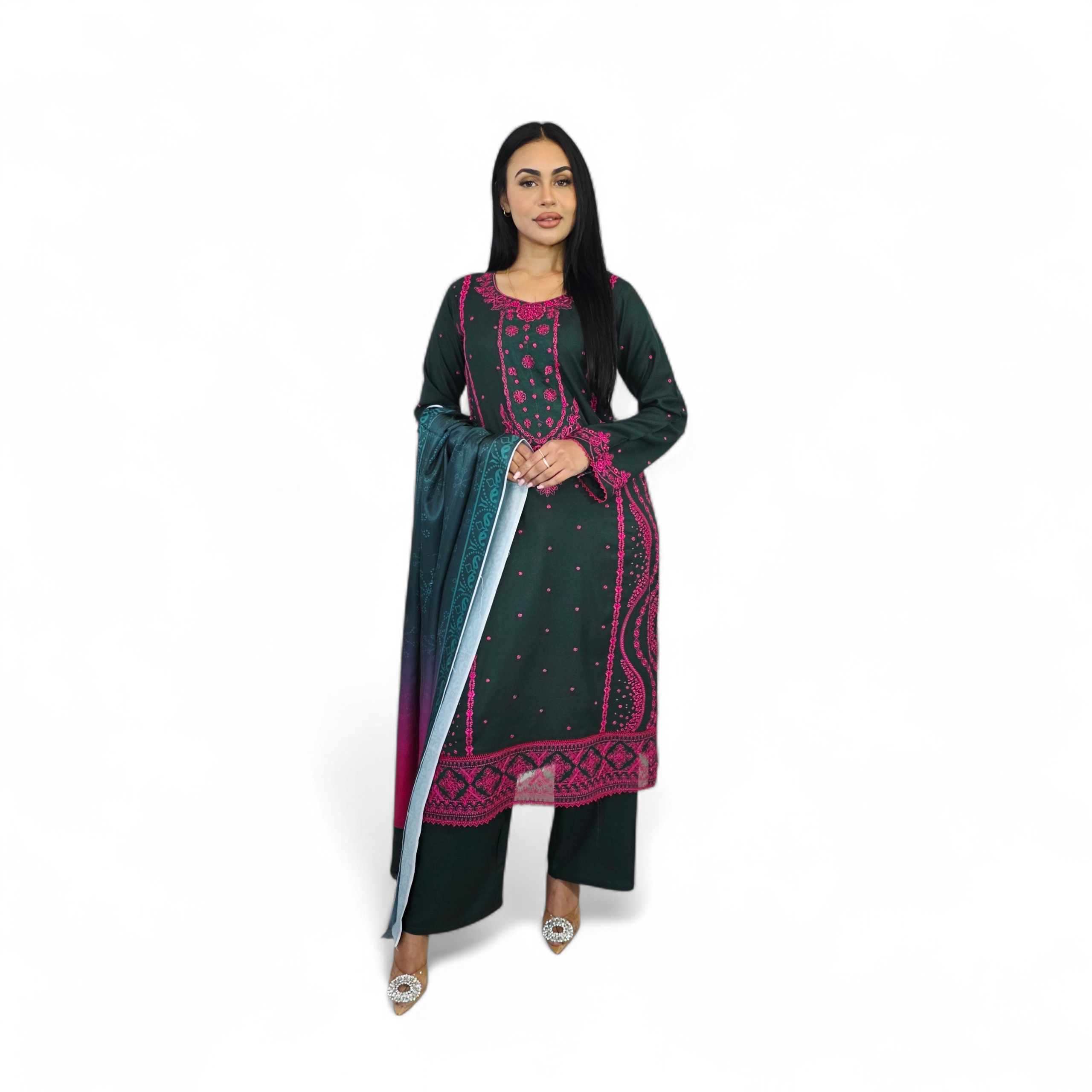 • Embroidered dhanak    kameez with  laces detailing