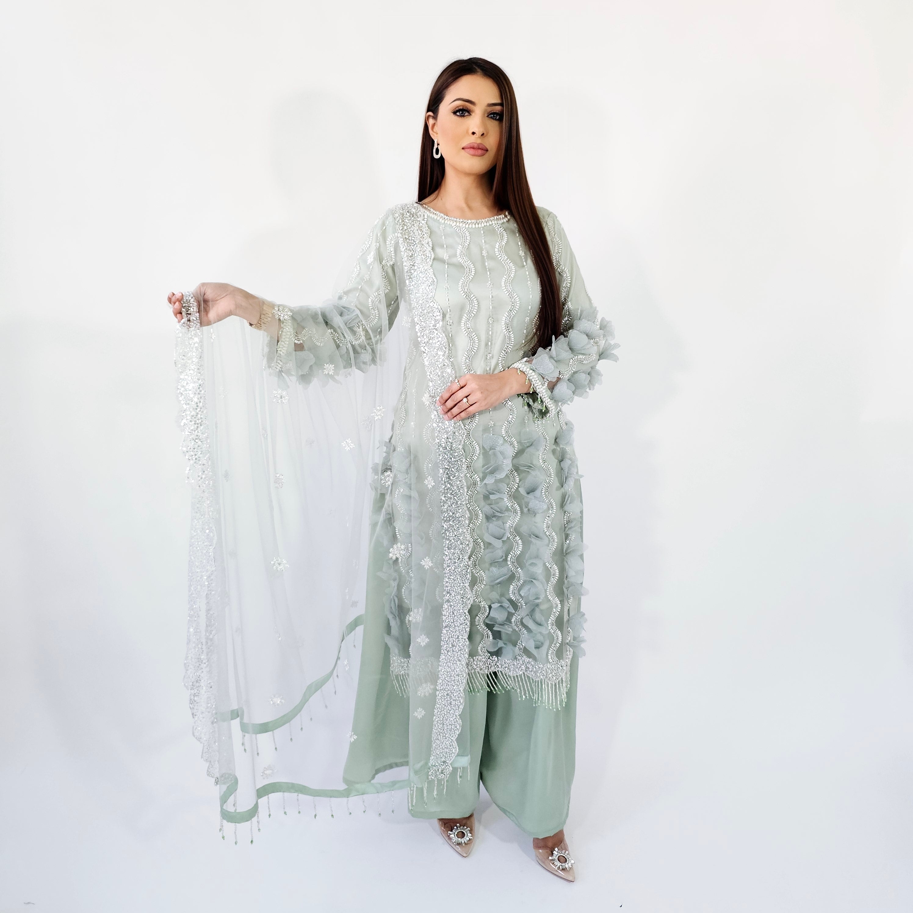 • Beautiful cut dana  embroidered kameez with beads, sequins and 3d flowers.