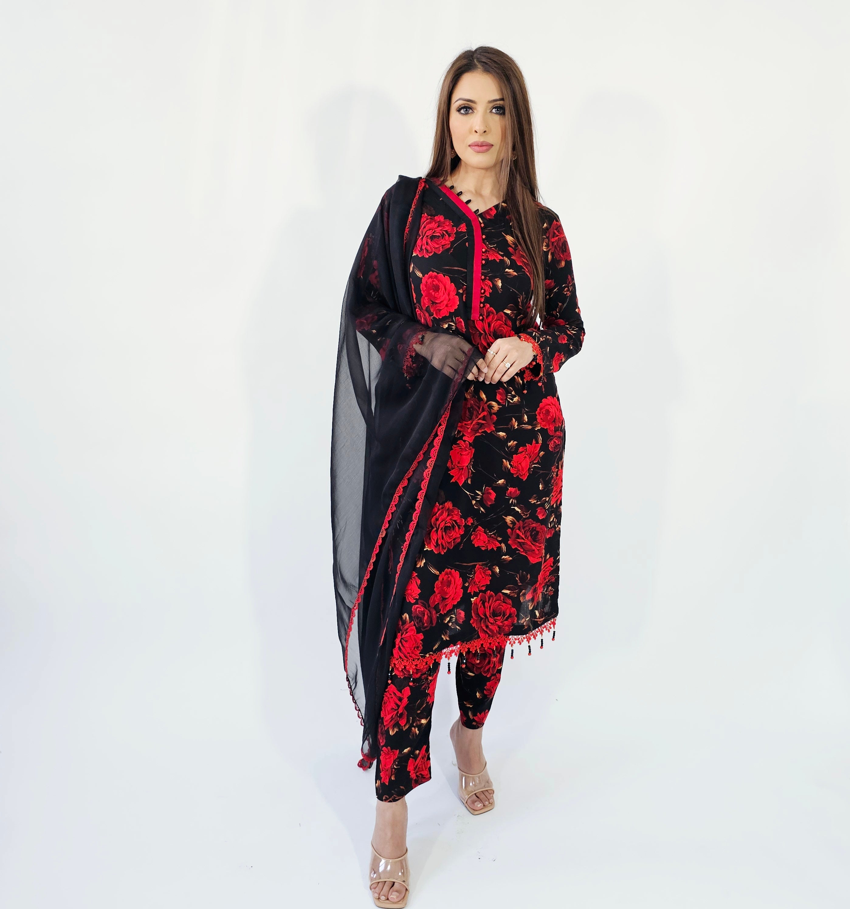 • Beautiful  printed kameez with  intricate lace detailing on daman sleeves and scarf.