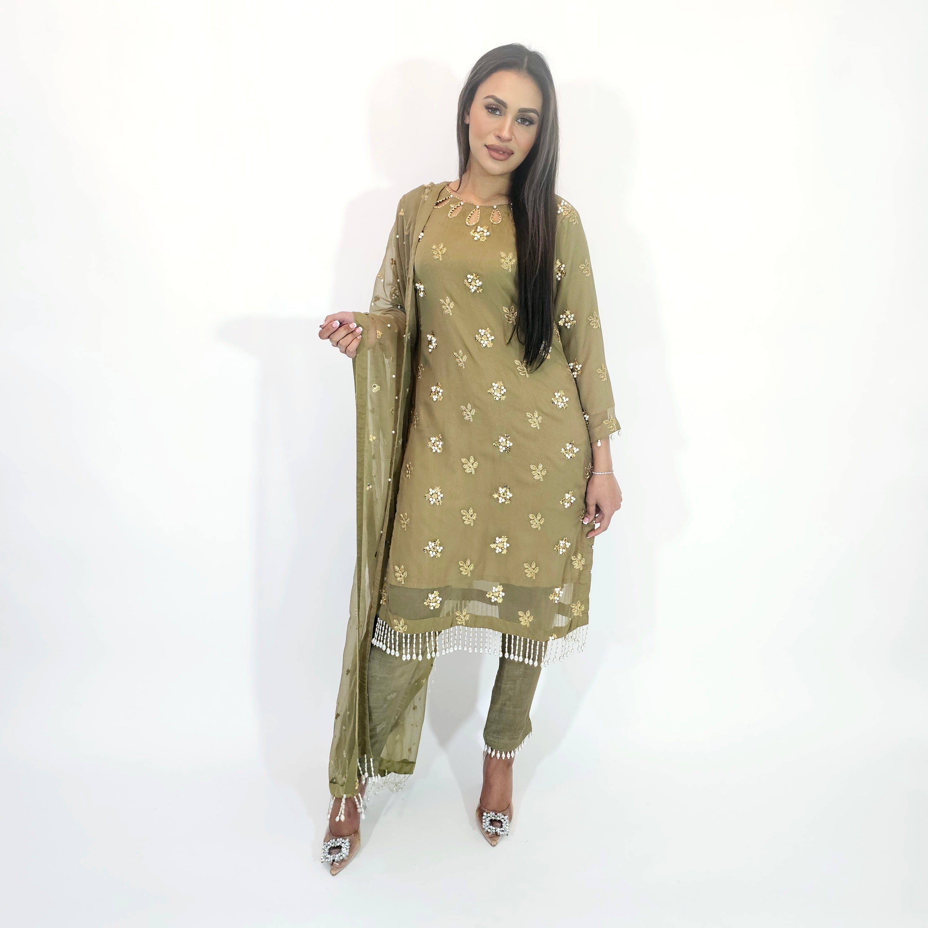 • Embroidered chiffon suit with sequins and  pearls