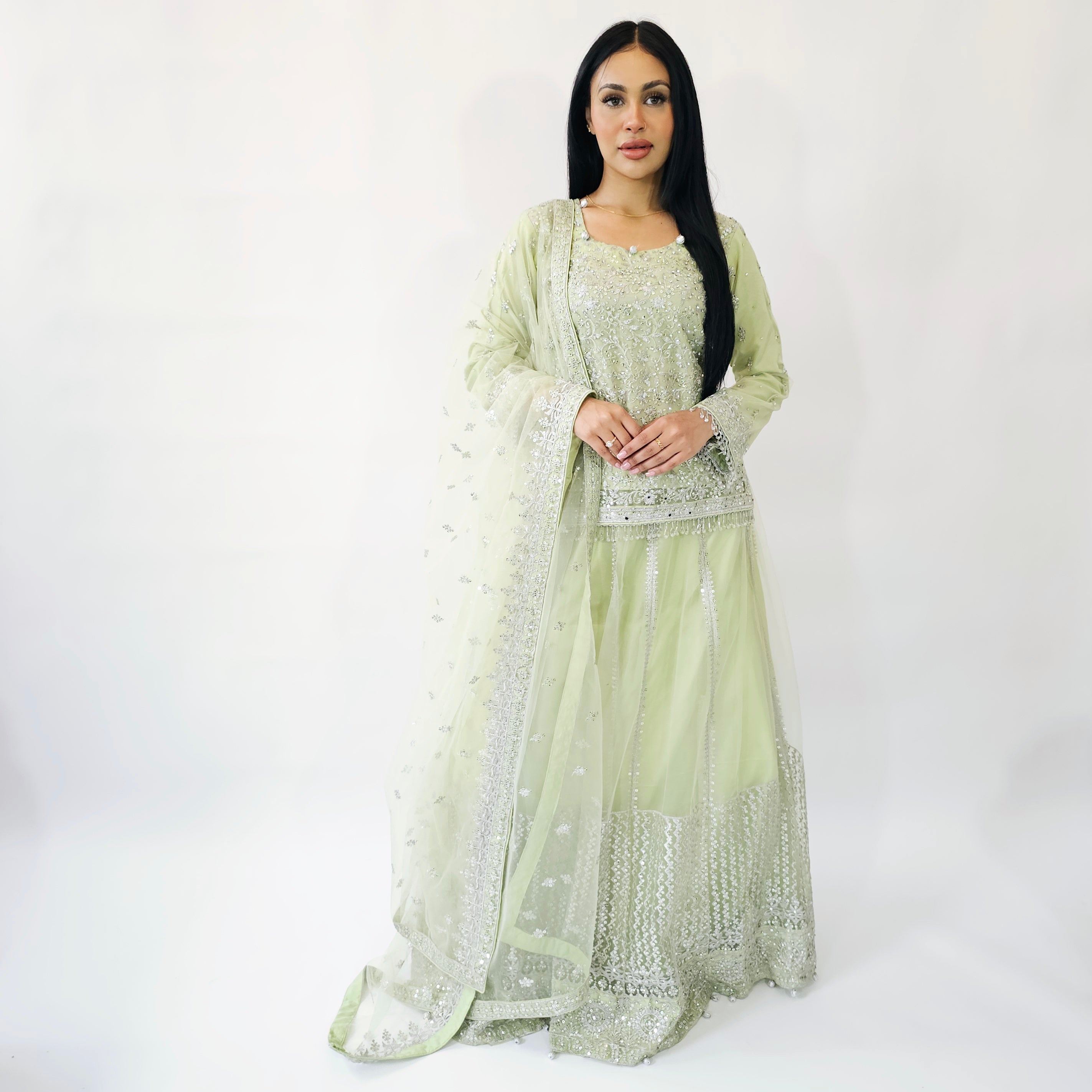 Net Lehnga choli with embroidery and stonework on Front and sleeves