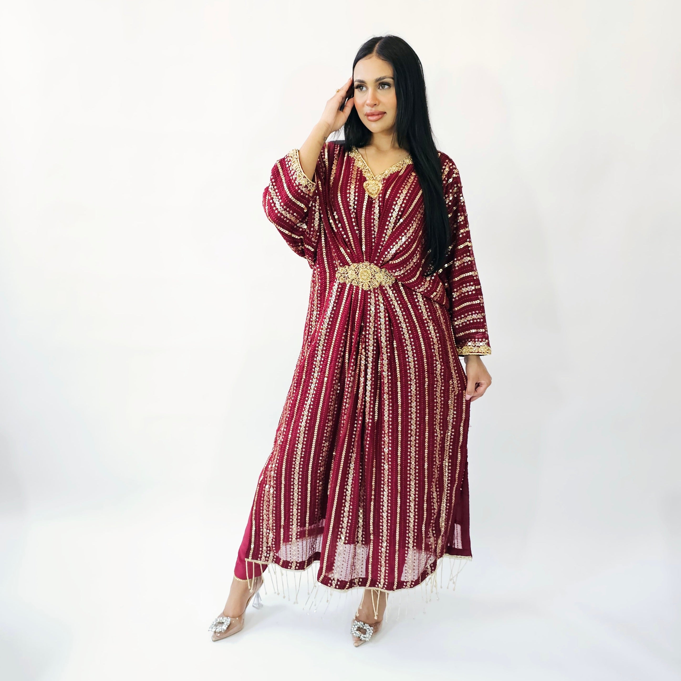 • Beautiful embroidered sequin   kaftan  with intricate beautiful hand work on neck line and waist motif to enhance the over look of the outfit making it look elegant and chic.