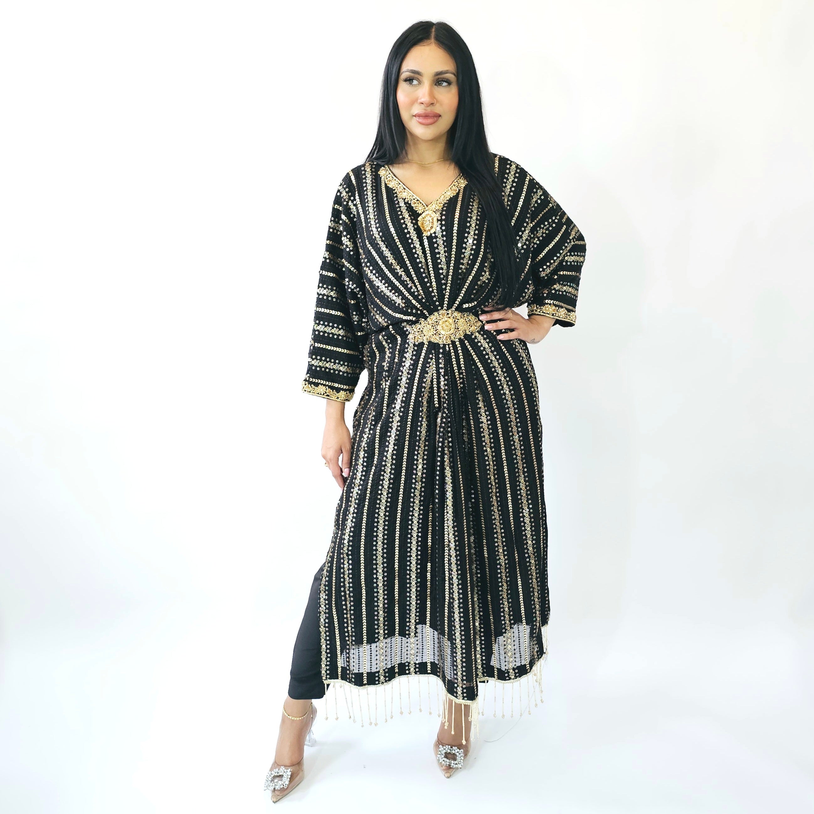 • Beautiful embroidered sequin   kaftan  with intricate beautiful hand work on neck line and waist motif to enhance the over look of the outfit making it look elegant and chic.