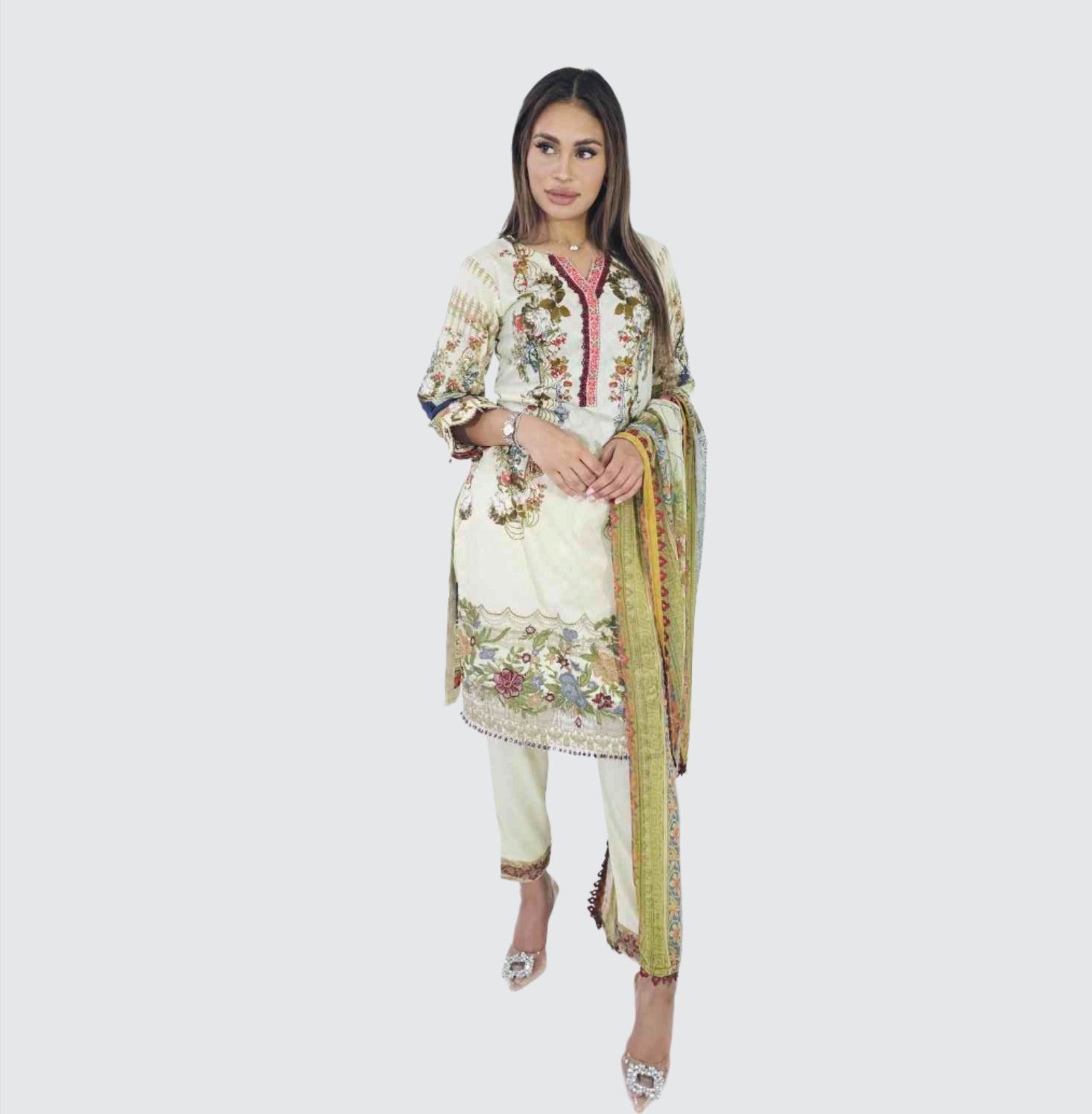 • Beautiful  printed kameez with embroidery laces and bead detailing
