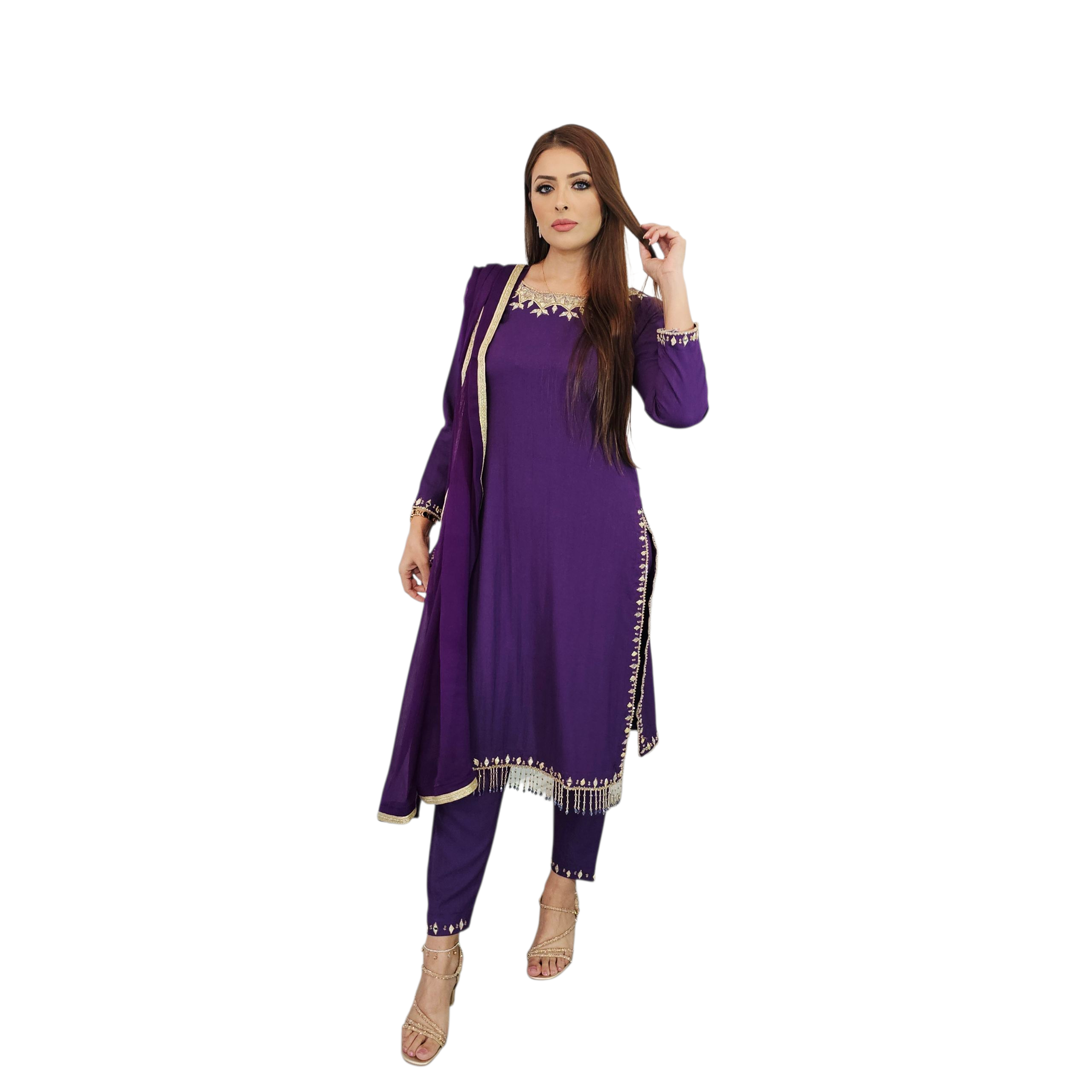 • Plain dhanak  kameez with embroidery and mirror work on neck line, sleeves ,chakh and daman finished of with stunning bead detailing  and laces
