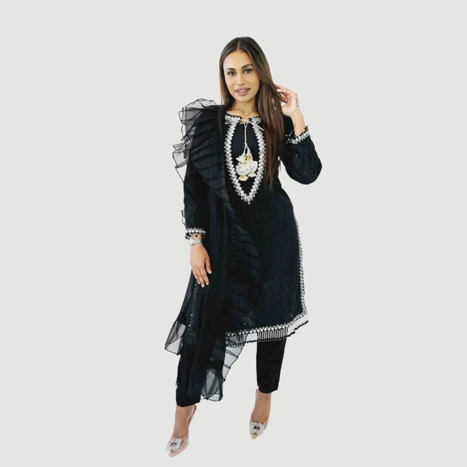 • Lawn chikkan kari lined  suit with mirror work on neck, daman and sleeves